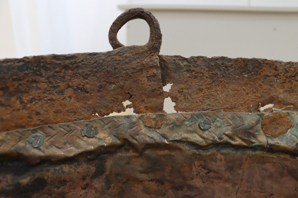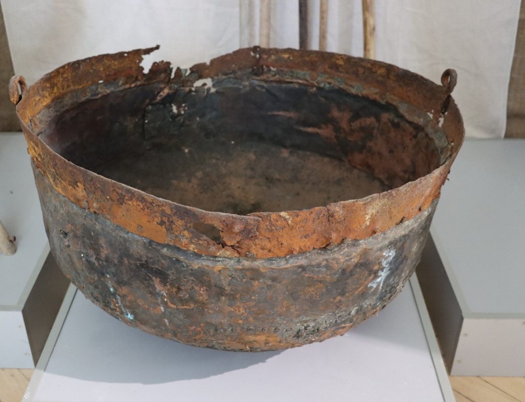 Рис. 2.1.Загальний вигляд казана великого. Наявні пошкодження залізної деталі та стінок посудини. Обліковий номер експонату НДФ 2575