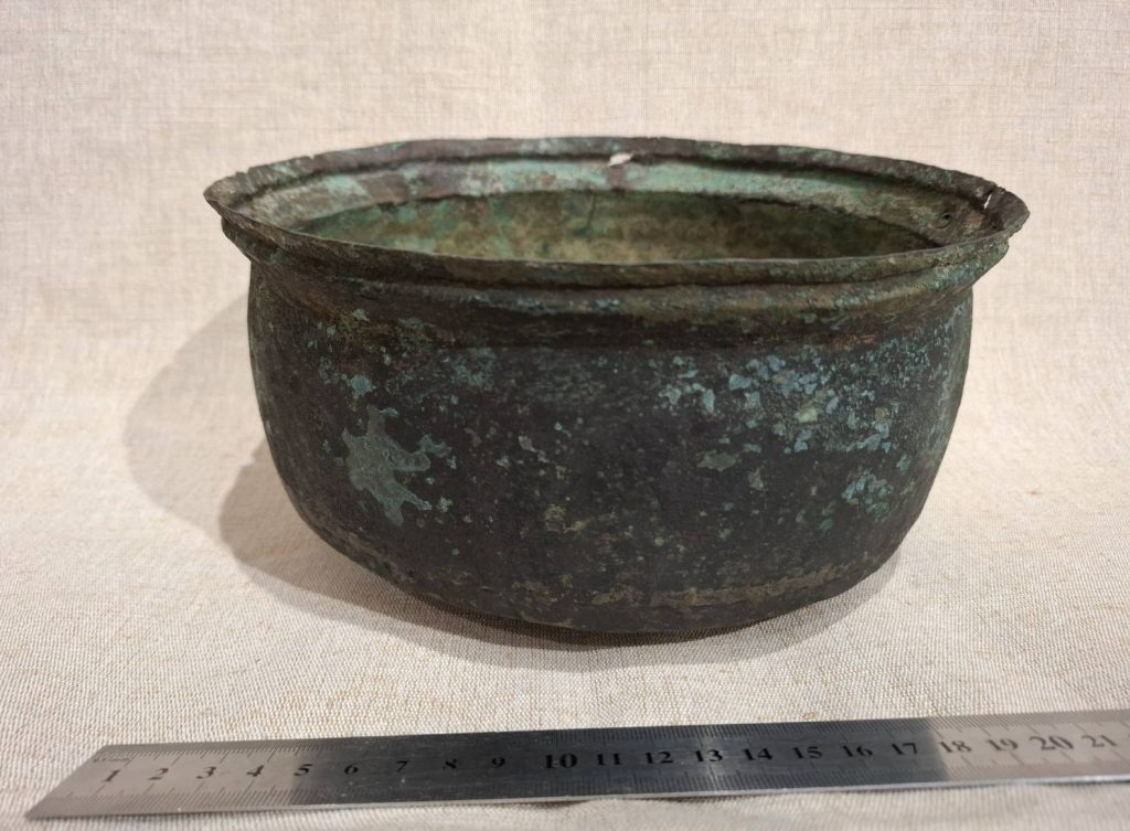 Казан №2. Колекційний обліковий номер НДФ-2575. Місце зберігання фондосховище Володимирського історичного музею. Казан виготовлений з листів кольорового металу (мідь), а окремі деталі з чорного металу (коване залізо). Казан круглої форми (опуклий), клепаний, тонкостінний .Складається з трьох частин: круглого корпусу та двох металевих пів-дуг. Корпус з пошкодженням, зокрема з отвором на денці, що закладений круглою пластиною, з’єднаною з основною частиною мідними клепками; До верхньої частини корпусу прикріплені дві металеві пів-дуги з’єднані між собою методом кування, і на них є дві великі петлі -вушка для підвішування казана. Між металевим окуттям, та корпусом казана- у верхній його частині на умовному вінчику зберігся простий геометричний орнамент у вигляді скошених коротких насічок З внутрішньої частині казана кілька мідних пластин-латок різної форми, прикріплених до корпусу мідними заклепками квадратної та круглої форми. Частина клепок відсутня. Напевне втрачені з часом.
